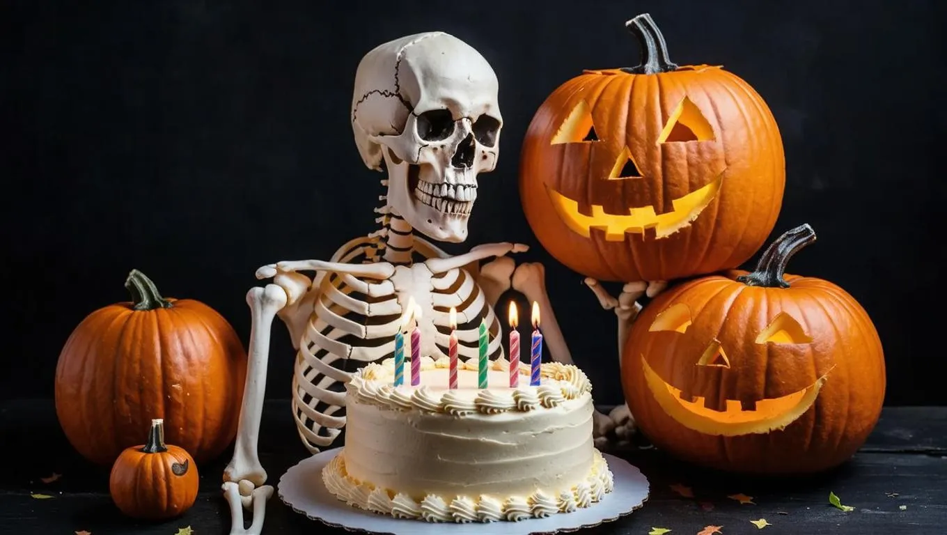 Create spooky-fun AI visuals with a skeleton wearing a jack-o'-lantern head holding a birthday cake. Vivago.ai blends Halloween horror and festive celebrations using advanced image generation tools. Craft eerie yet playful art with curated AI effects for eye-catching, professional-grade Halloween-birthday fusion content.
