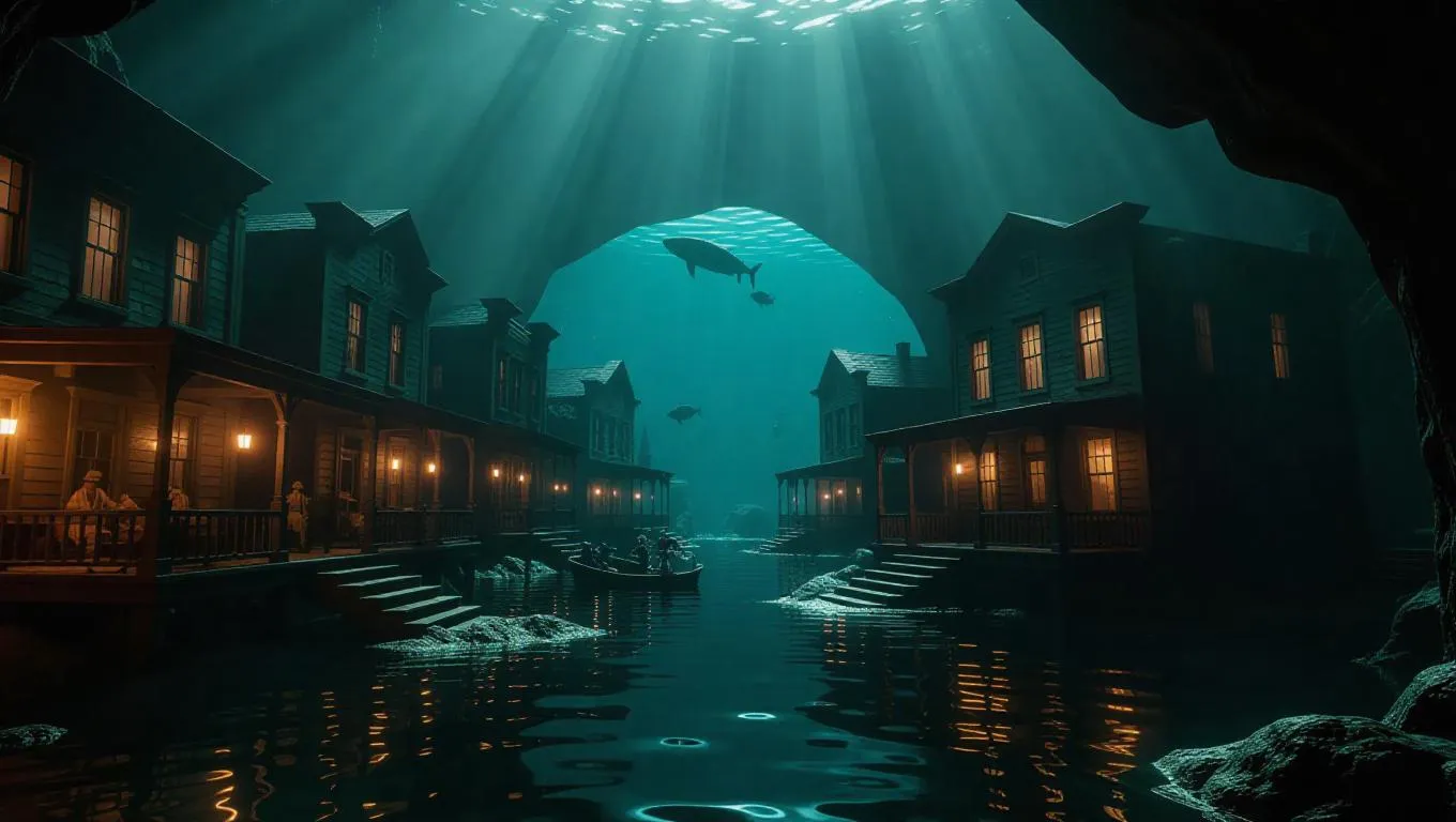 A hyper-realistic, cinematic scene set deep under the sea, featuring a submerged western town with old western buildings and people living in it. The environment is bathed in deep sea colors with super clarity, enhanced by cinematic lighting that highlights the textures and details of the underwater structures and the inhabitants. The composition should evoke a sense of wonder and mystery, with a perspective that captures the vastness of the underwater world, possibly a wide-angle shot to include the entire town. The lighting should be dramatic, with rays of light piercing through the water to create a melancholic yet awe-inspiring atmosphere. The art style should be hyper-realistic, with attention to the smallest details to make the scene as lifelike as possible.