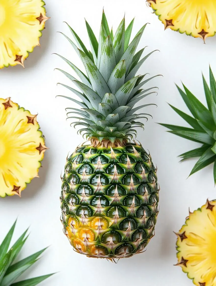 Generate vibrant AI images of a whole pineapple with golden, textured skin and sharp green stems, set against a pristine white background. Perfect for tropical-themed visuals, this high-quality rendering enhances creative projects with its striking, lifelike details and professional-grade clarity.