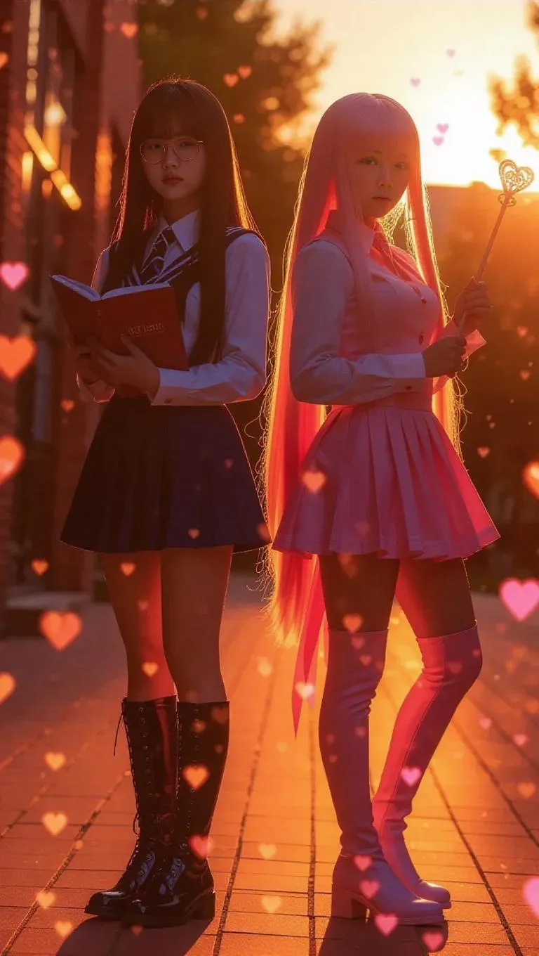 VivaGo.ai crafts cinematic dual-character AI art: serene student vs radiant magical girl transformation. Features dramatic sunset-to-starlight transitions, glowing effects, 4K details. Perfect for anime-inspired posters with dynamic contrasts, spellbinding visuals, and professional-grade "Two Hearts, One Light" fantasy compositions.