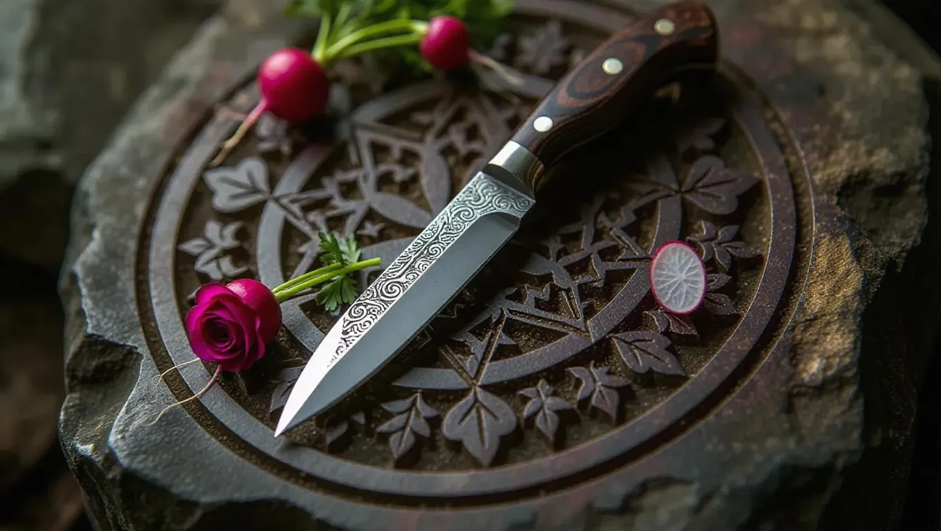 Discover AI-generated visuals blending culinary artistry with ancient mystique. Explore a paring knife juxtaposed with pagan symbols and intricate radish rose garnish. Perfect for chefs, designers, or creatives seeking unique, symbolic imagery. VivaGo AI crafts professional-grade content from text prompts, merging food aesthetics and mystical elements seamlessly. Elevate your projects with AI-powered precision and curated effects.