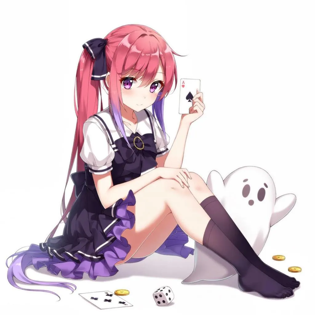 kyoto anime stylelightshadow,(beautiful color,detailed,best quality,amazing quality,very aesthetic:1.5),1girl,purple eyes,long hair,solo,bow,smile,heterochromia,pink hair,sitting,drill hair,side ponytail,spade (shape),card,hair bow,purple hair,looking at viewer,ghost,coin,dice,socks,asymmetrical legwear,thighhighs,。
