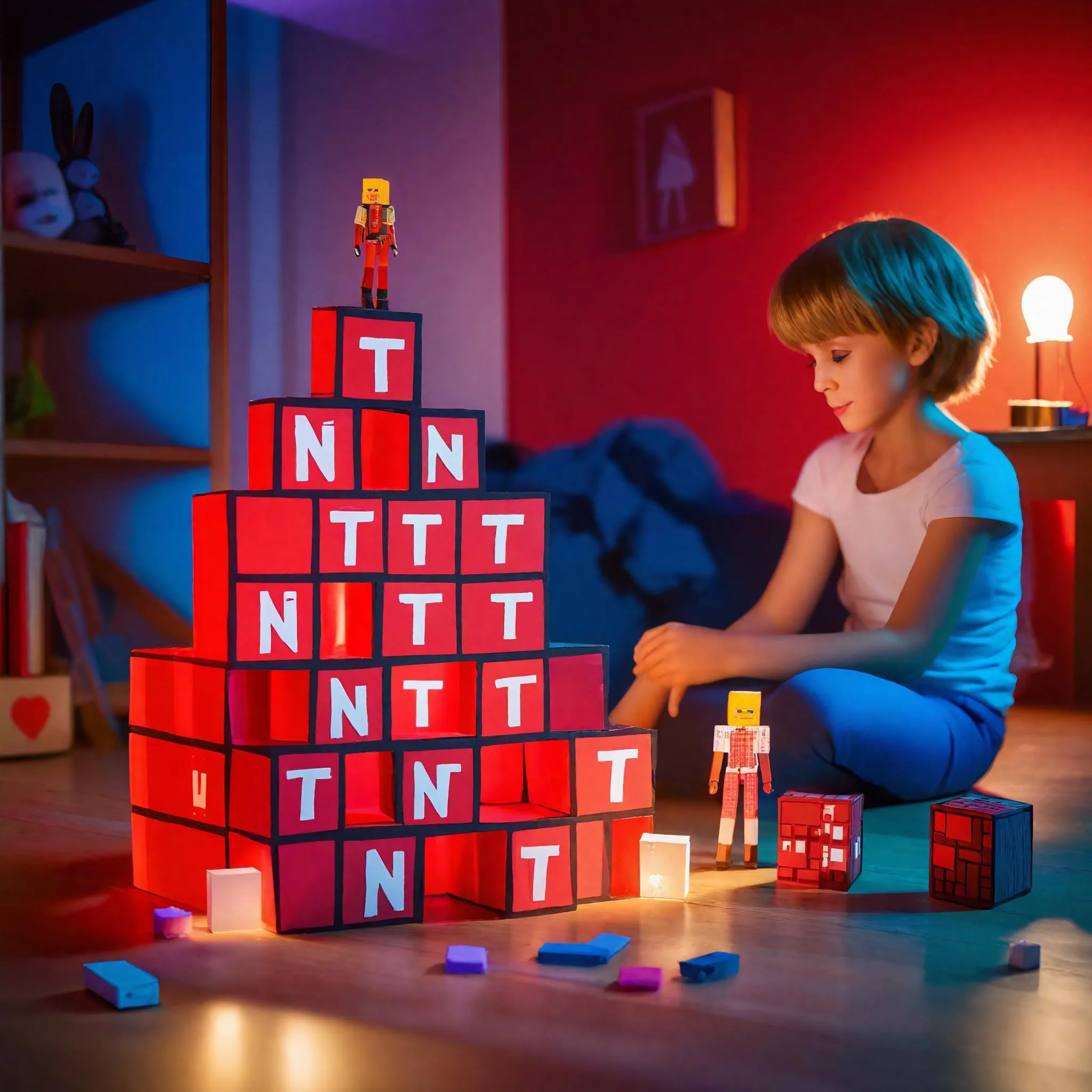 A photorealistic scene in a cozy child’s bedroom during late evening, lit only by a warm desk lamp. On the wooden floor stands a large toy house or castle built entirely from handmade paper blocks styled like Minecraft TNT — red paper cubes with hand-drawn 'TNT' labels, slightly crumpled edges showing childlike craft. At the top of the structure sits a Barbie doll in a sparkling pink dress, long blonde hair flowing as if guarding the tower. The 7-year-old boy in pajamas leans in close, holding a toy lighter. One of the paper TNT blocks has caught fire — small flames and bright sparks shoot out like a safe fireworks display. The boy’s face glows in the orange light, his eyes wide with awe. A faint trail of smoke rises into the air. The Barbie doll remains seated on top of the structure, catching some of the sparks. The mood is playful yet surprisingly dramatic, captured at child-eye level in hyperrealistic style.