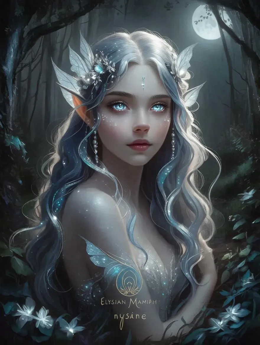 Generate a hauntingly beautiful AI image of an ethereal elysian nymph in a misty moonlit forest. Her translucent form, glowing eyes, opalescent hair, and spectral wings embody supernatural enchantment. This digital painting merges eerie tranquility with ethereal beauty, perfect for fantasy art lovers seeking mystical realms through AI-powered creativity.