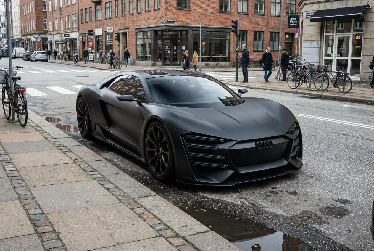 Transform text into a realistic photo of an authentic parked car with exact details. Capture this vehicle on a city street scene, lights off, in a candid street photography style. Generate high-quality, camera-ready visuals using advanced AI-powered photo generation tools for professional results.
