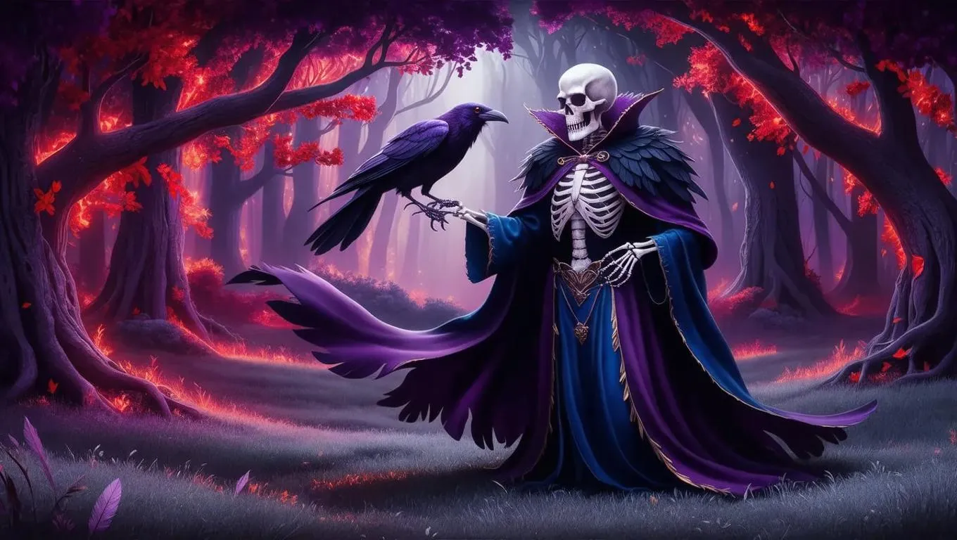 Explore AI-generated mystical forest art with vivid purple-red treetops and eerie grey grass. Featuring a majestic crow-skulled mage in rich purple linen and floating dark cape, blending crow talons with human hands. Magical 3D rendering, anime-style fluorescence, and League of Legends aesthetic for enchanting, mysterious visuals.