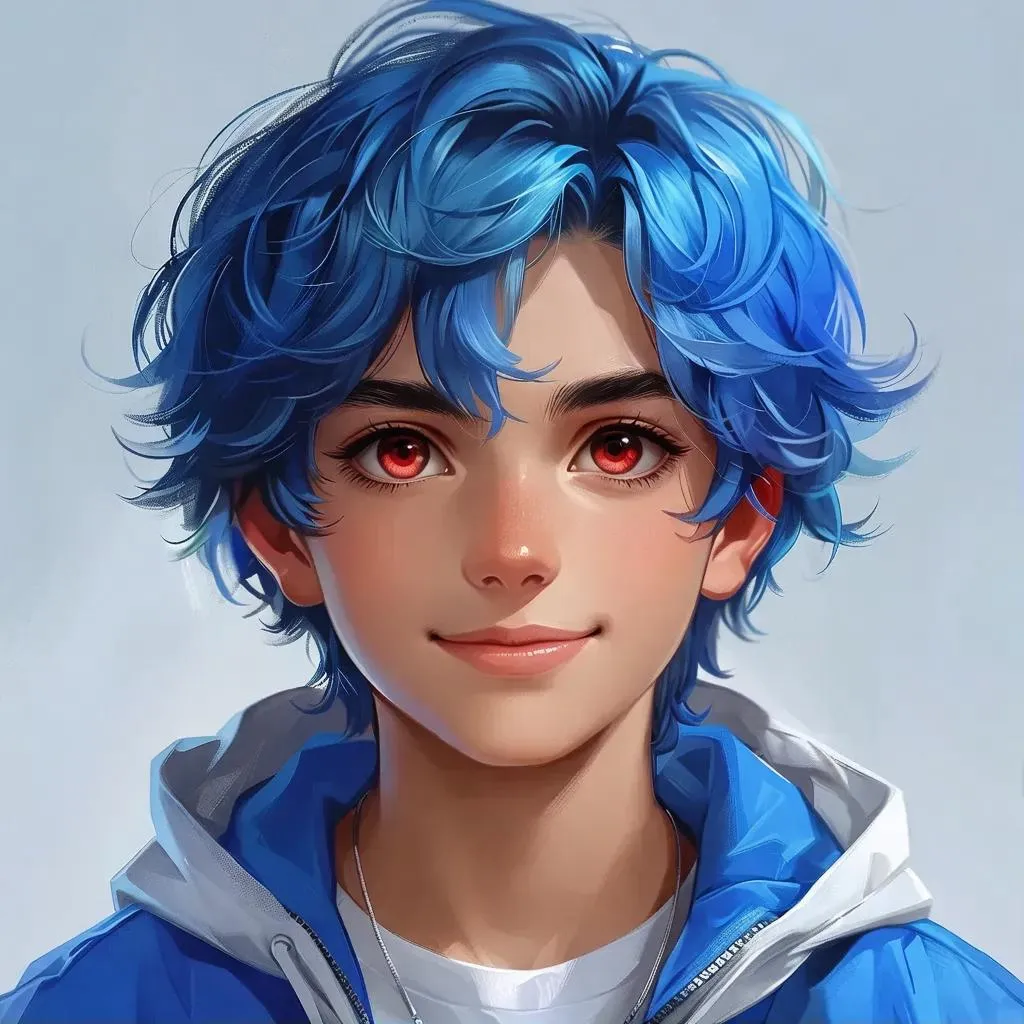 Create vibrant AI images of a cheerful youngster with striking red eyeballs, tight blue hair, and a stylish jacket using VivaGo.ai. Generate high-definition visuals featuring a round face radiating happiness through advanced AI effects. Transform your creative ideas into professional-grade content with precise text-to-image prompts and cutting-edge editing tools.