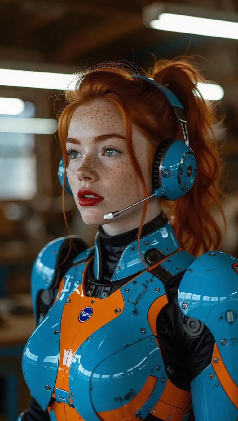 Leica M 90s aesthetic photo of pretty 24 year old English woman, natural red hair in messy twintails, freckles, red lipstick. wearing a thick glossy polished finely detailed blue and orange mech armour with white glowing accents, matching headset with mech insect antenna, in old workshop, stretching yawning. Lit by strip lighting, intricate details