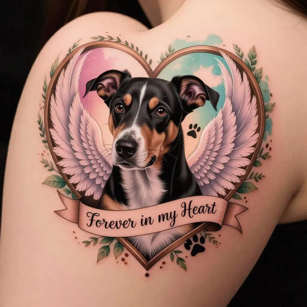 Memorial tattoo design featuring a realistic Italian Hound portrait in a heart-shaped frame with angel wings, paw prints, and "Forever in My Heart" banner. Soft pastel watercolor backdrop highlights loyalty, love, and serene remembrance. Intricate details capture the dog’s expression, flowing wings, and elegant text, celebrating companionship with a close-up, heartfelt perspective. Ideal for honoring cherished bonds.