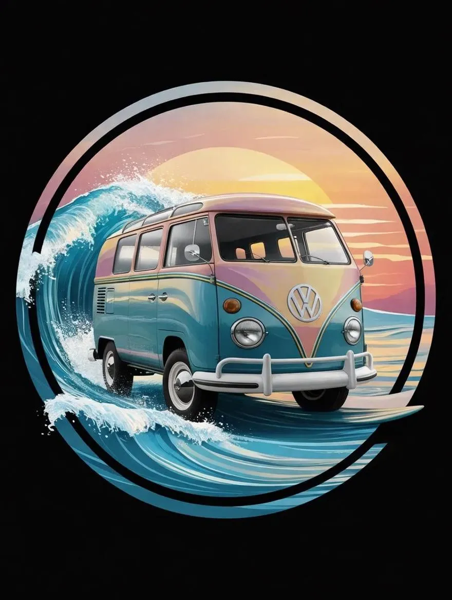 Generate a vibrant AI image featuring a pastel-colored Volkswagen truck at the center, encircled by a gradient sunset backdrop with a bold black border. Embrace surf-inspired line movements, ripped textures, and dynamic sea wave vectors for a professional-grade creative design. Powered by vivago.ai's advanced AI tools.