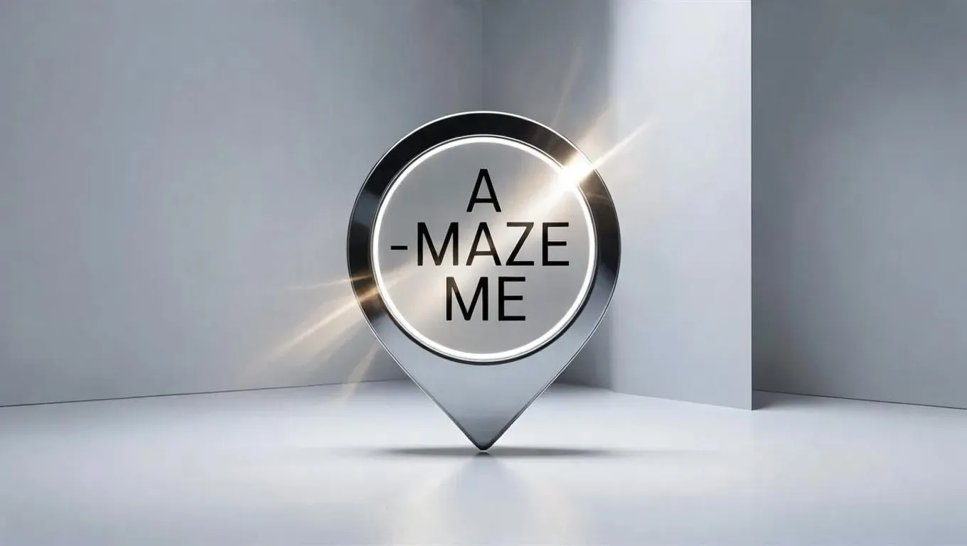 Generate an AI GPS pointer with "A-maze-Me" text integrated in a minimalist design. Vivago.ai crafts custom map markers featuring clean typography and solid-color backgrounds, perfect for location pins, navigation visuals, or creative projects. Enhance your designs with precision AI tools for professional-grade effects and seamless text-image integration.
