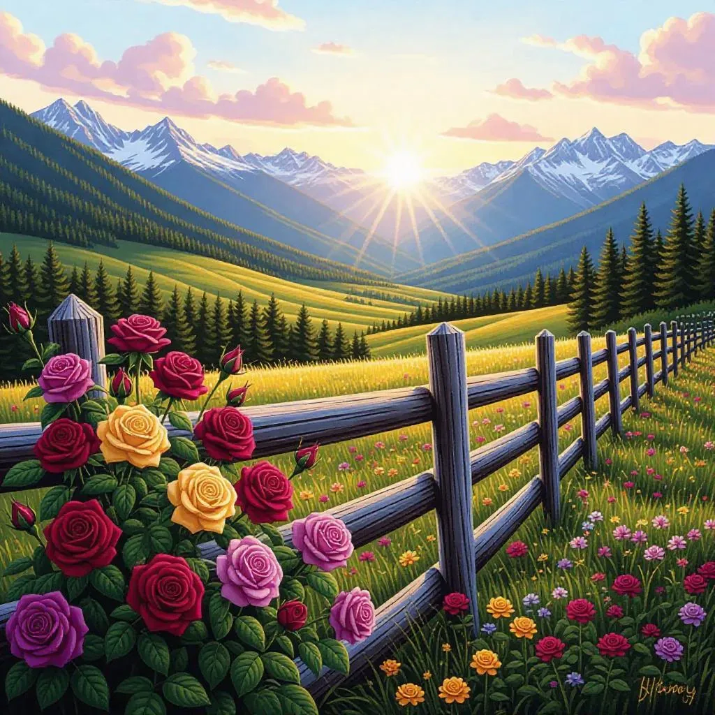 Vivid floral landscapes with vibrant roses, charming fences, distant mountains, and lush green grasslands. Crafted by AI for serene countryside scenes and artistic inspiration. Create vibrant garden imagery with artistic AI effects for custom visual content. Transform your ideas into stunning AI-generated paintings with advanced creative tools.