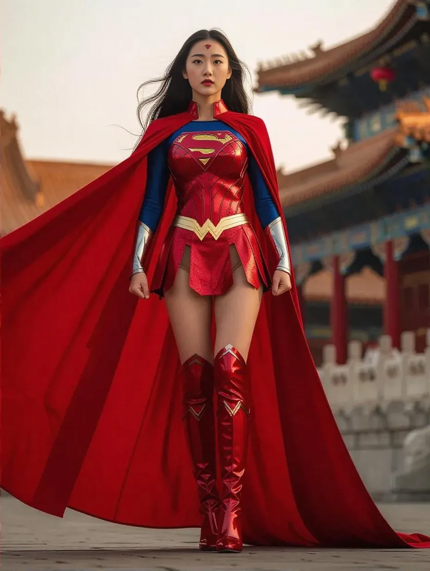 Chinese woman in a red supergirl costume, red cloak, red knee-high boots, Chinese Supergirl red star. Full body shot, zoomed in from afar to showcase her appearance. Seam in the middle of legs, cloak fluttering, feet neatly crossed, seam completely diverged. Standing in a full, confident posture. (4K HDR 60 FPS)