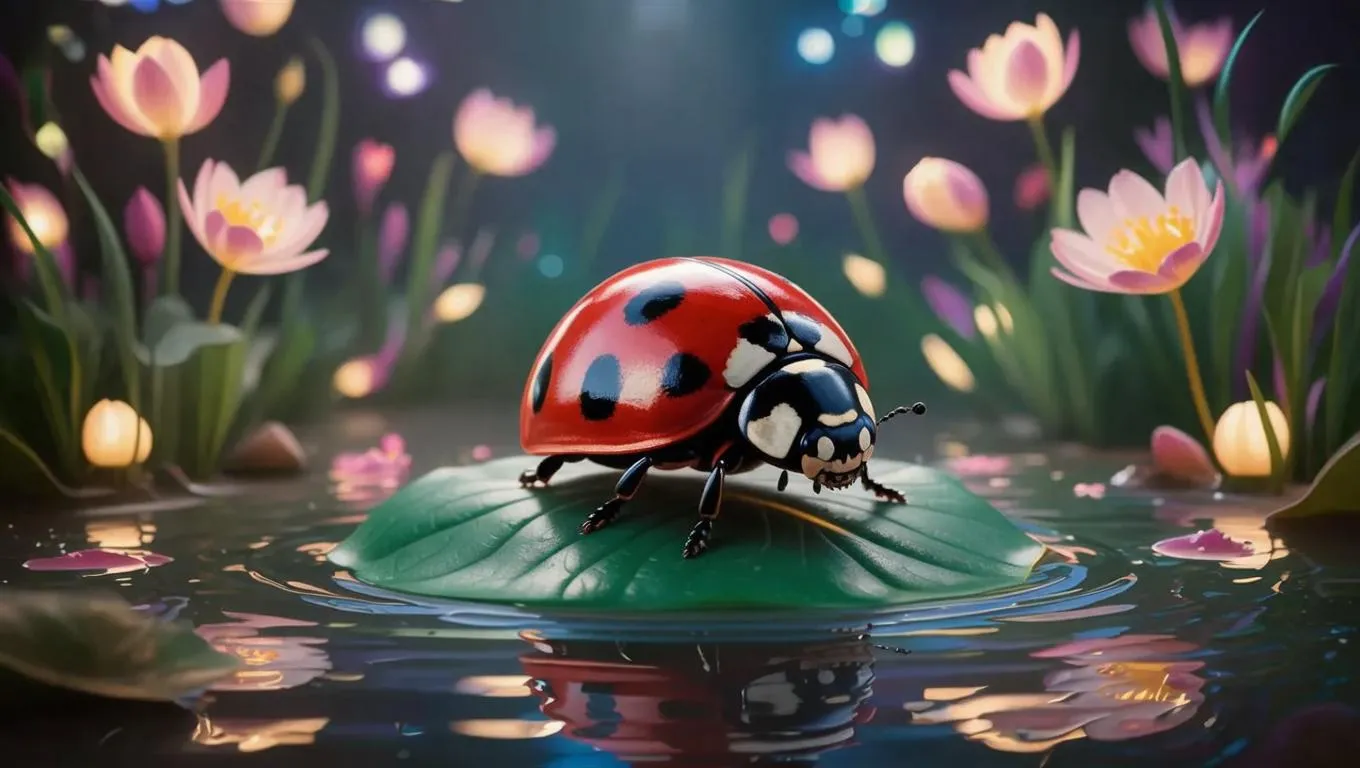 Create a stunning 3D scene with AI: A vibrant ladybug rests on a leaf in a flooded garden, blending nature's beauty with surreal water reflections. Perfect for dynamic visual storytelling, lifelike animations, or artistic projects. Elevate your creativity with vivago.ai's advanced AI tools for immersive, high-quality renders.