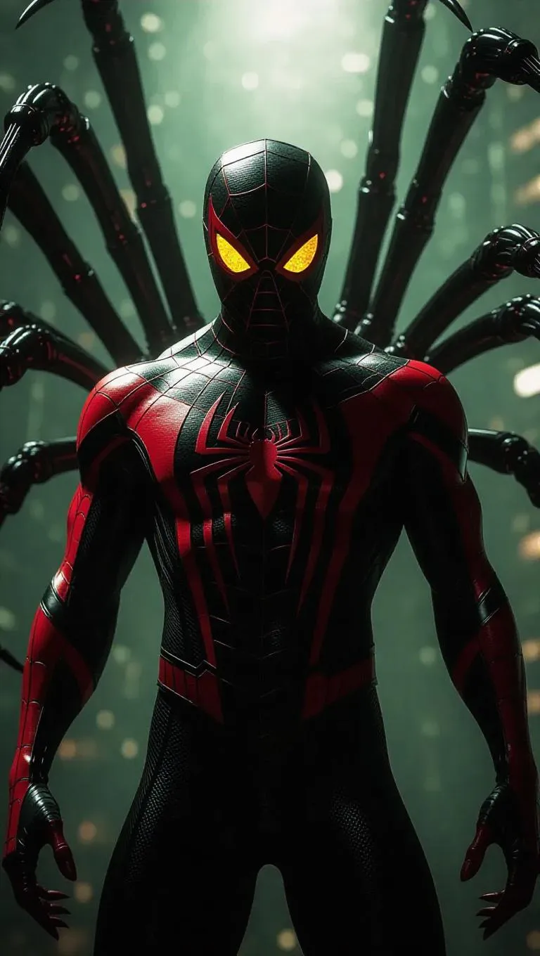 A powerful spider-inspired hero emerges from the shadows, wearing a distinctive red and black costume adorned with the iconic spider emblem. Multiple arachnid limbs extend from the figure's back, creating an imposing silhouette. The character stands against a mysterious green-tinted background, enhancing the otherworldly atmosphere. Glowing yellow eyes on the mask contrast sharply with the dark costume, embodying menace and heroism in this dramatic, cinematic scene.