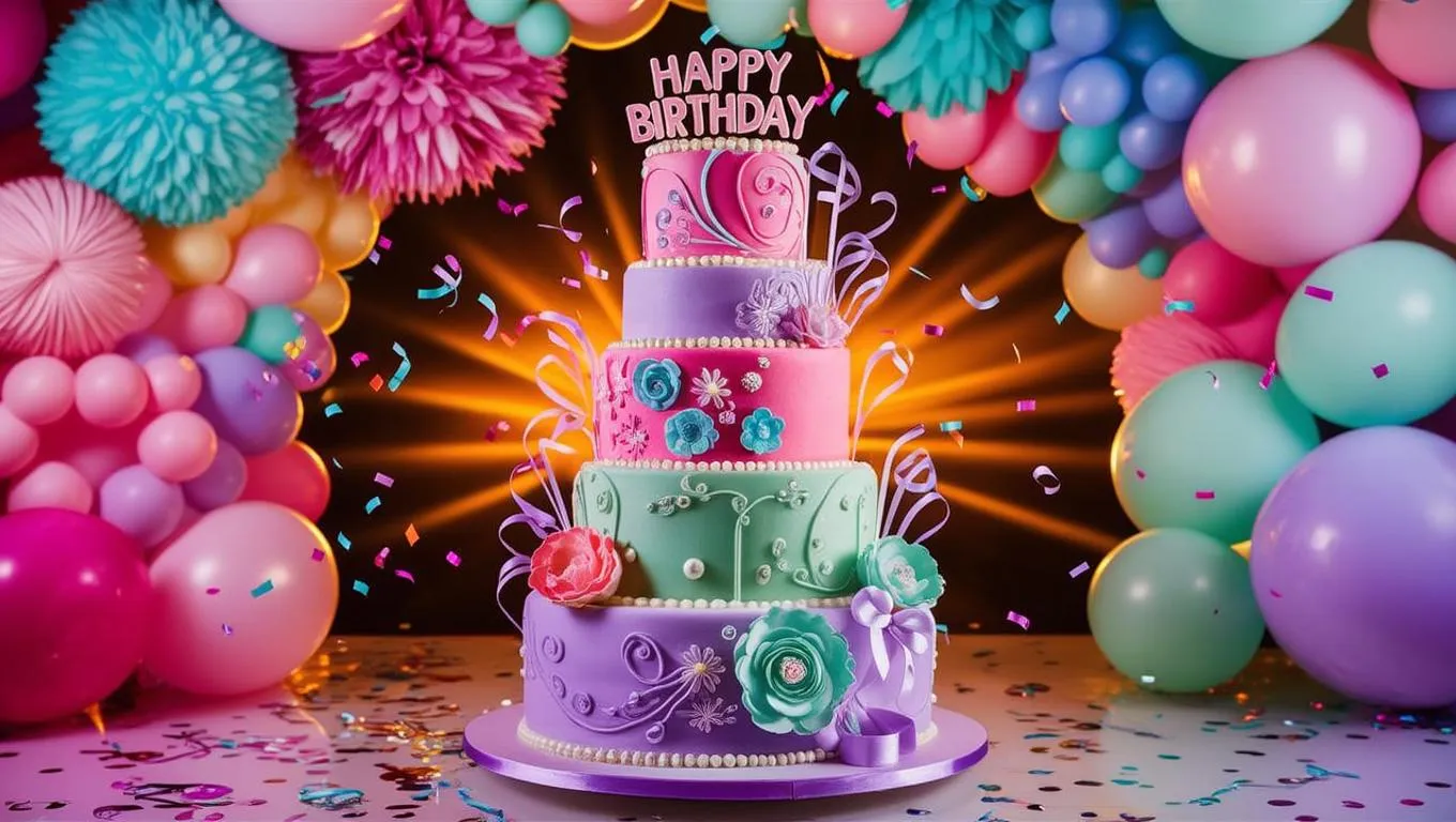 Create vibrant AI-generated birthday scenes with bold pastel multi-tiered cakes, floral patterns, edible pearls, colorful balloons, and festive confetti. VivaGO.ai crafts lively celebrations using advanced AI tools for stunning visuals and warm, radiant lighting.