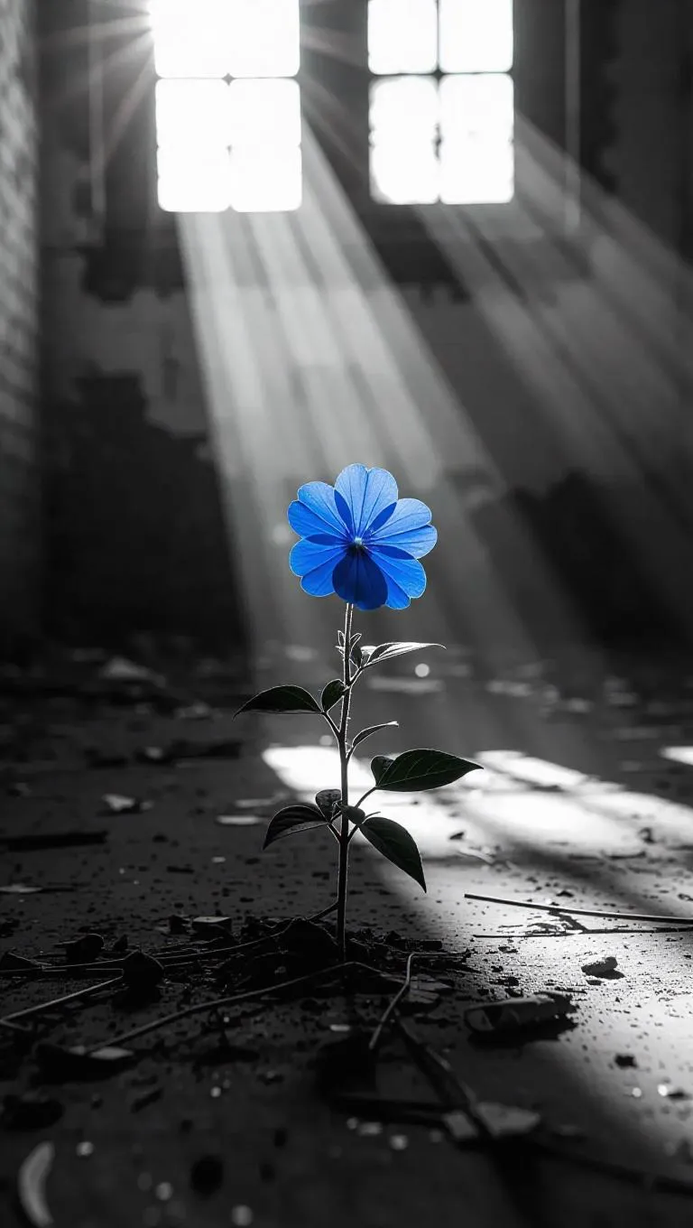 Only Blue flower, single or double, only thing colour is the flower growing in a black and white desolate abandoned building in the only ray of sun