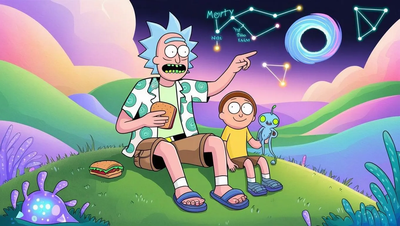 Generate peaceful AI watercolor scenes of Rick and Morty bonding on alien worlds. Vivago.ai transforms prompts into soft washes, Hawaiian shirt portal patterns, bioluminescent flora, and warm palettes for professional illustrations with subtle chaos details. Create rare calm moments using AI art tools for vivid, story-rich visuals.