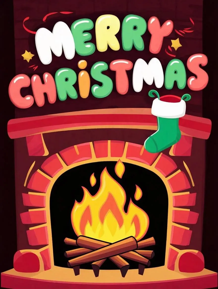 Create a festive AI-generated cartoon fireplace scene with dancing flames, Merry Christmas in bubbly letters, and a charming hanging stocking. Perfect for holiday cards, social media, or digital decor. Explore vivago.ai's AI effects for vivid, whimsical visuals blending warmth, cheer, and seasonal magic in seconds.