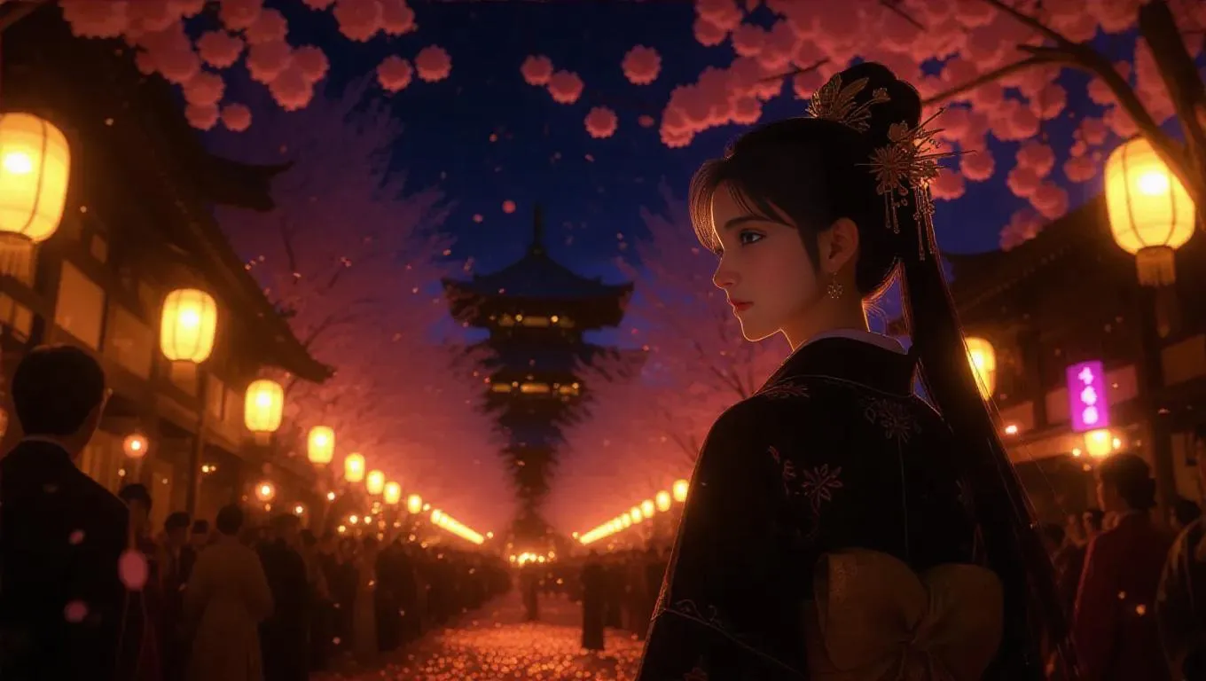 Experience a vibrant Chinese-style AI-generated anime scene of a lantern festival with ancient romance. Noble carriages, swirling dancers, and a poet's quest under glowing lanterns lead to an ethereal encounter with a golden-haired maiden. Soft particle effects, dreamy lighting, and traditional aesthetics blend in this animated depiction of Tang Dynasty splendor.
