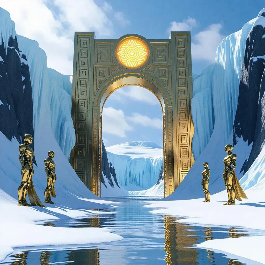 Explore AI-generated Antarctic landscapes with golden alien portals and futuristic guardians. Vivago.ai transforms text prompts into stunning visuals of icy terrains, intricate golden arches, and armored figures, blending ancient mystique with sci-fi elements. Create professional-grade snowy vistas, ice cliffs, and symbolic architecture effortlessly using advanced AI image generation tools.