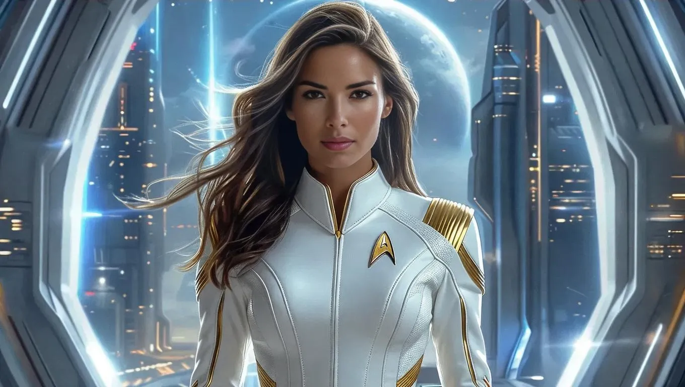 Generate a Star Trek-inspired female character in a futuristic uniform with striking white-brown hair using AI. Create sci-fi visuals with VivaGo.ai's image generator for professional-grade character design, interstellar aesthetics, and iconic franchise-style storytelling.