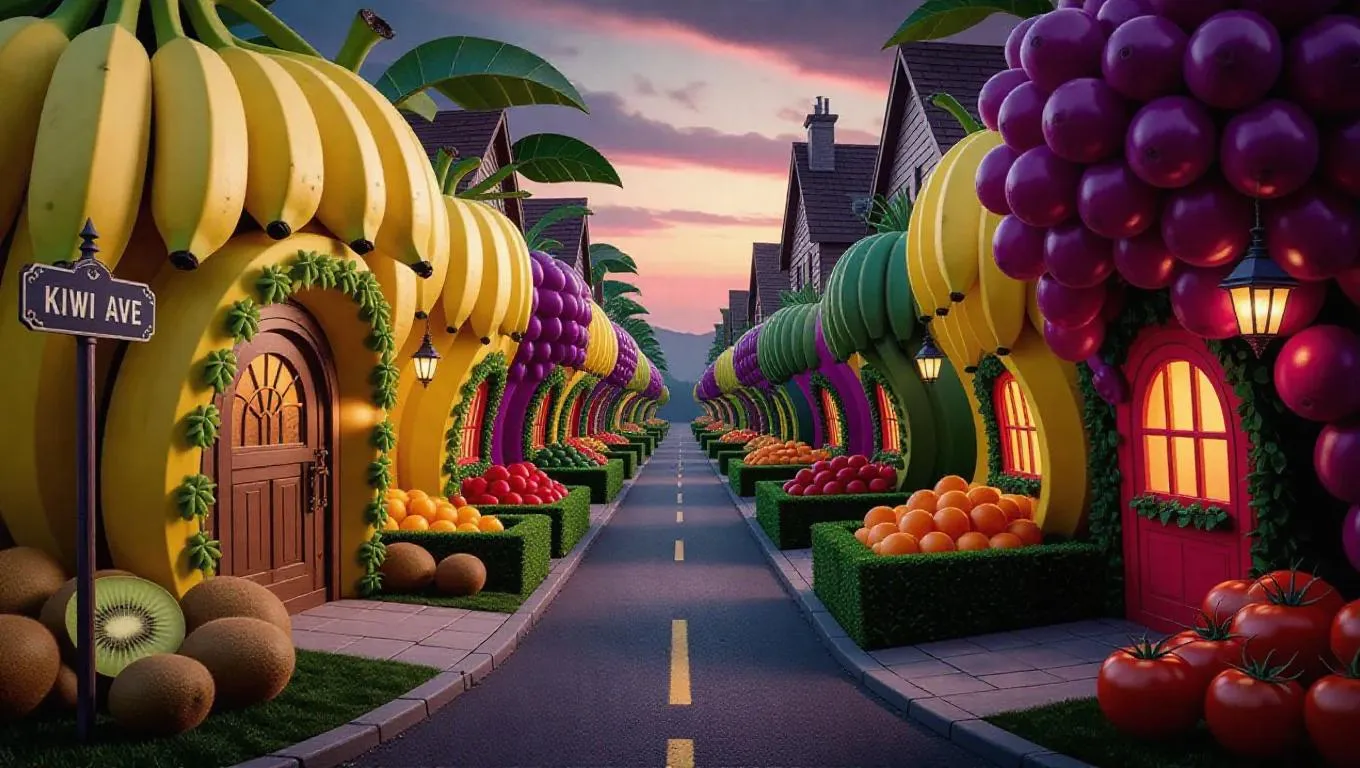 Explore AI-generated fruit cityscapes with whimsical vibrant dusk scenes. Discover banana street lanterns, grape hedges, dragon fruit windows, and Kiwi Ave. Create surreal fruit architecture using cantaloupe, tomato shelters, and kiwi vistas. Transform text into dreamy, ethereal towns with Vivago.ai's AI image generator.