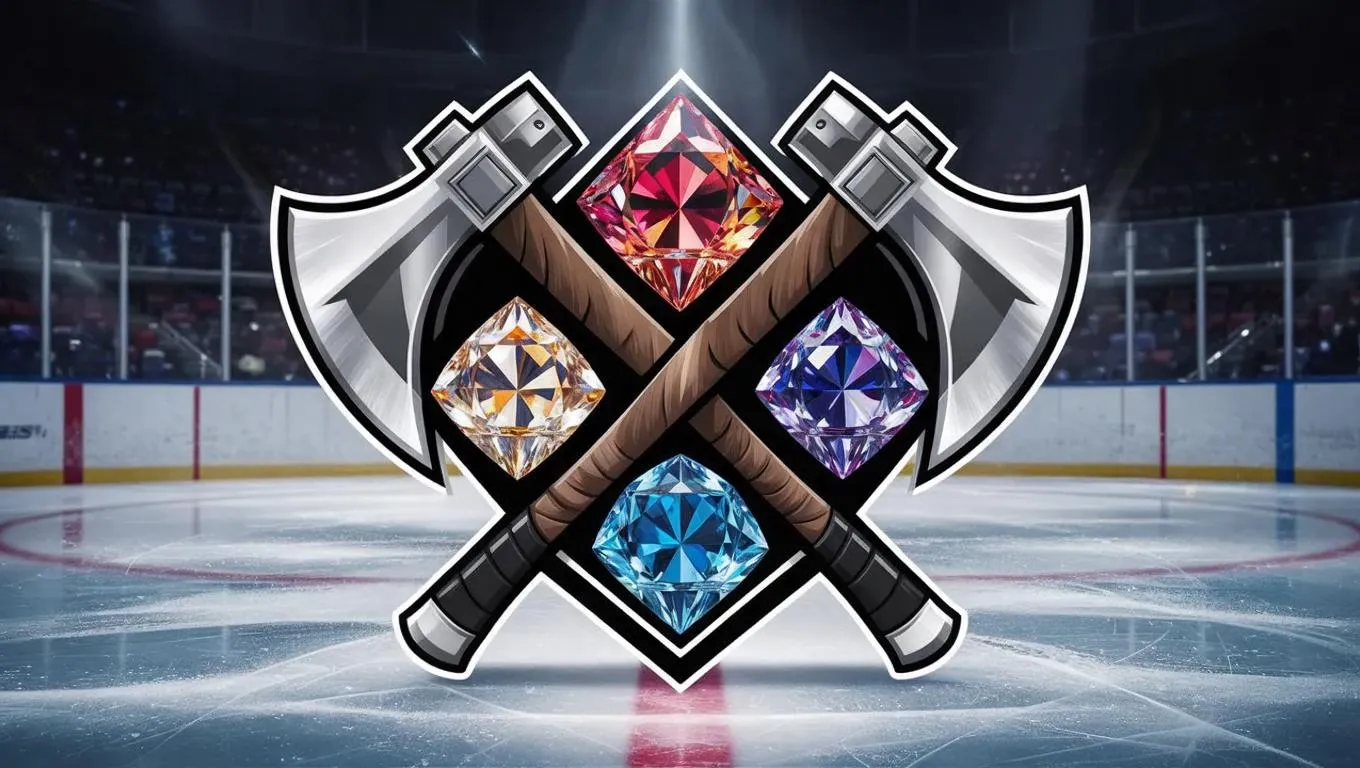 Create a dynamic hockey logo with a double-sided pickaxe and vibrant colored gems. Designed for jerseys in bold, traditional hockey style. Customizable AI-generated emblem for teams, blending rugged charm and professional aesthetics. Perfect for standout branding using AI tools.