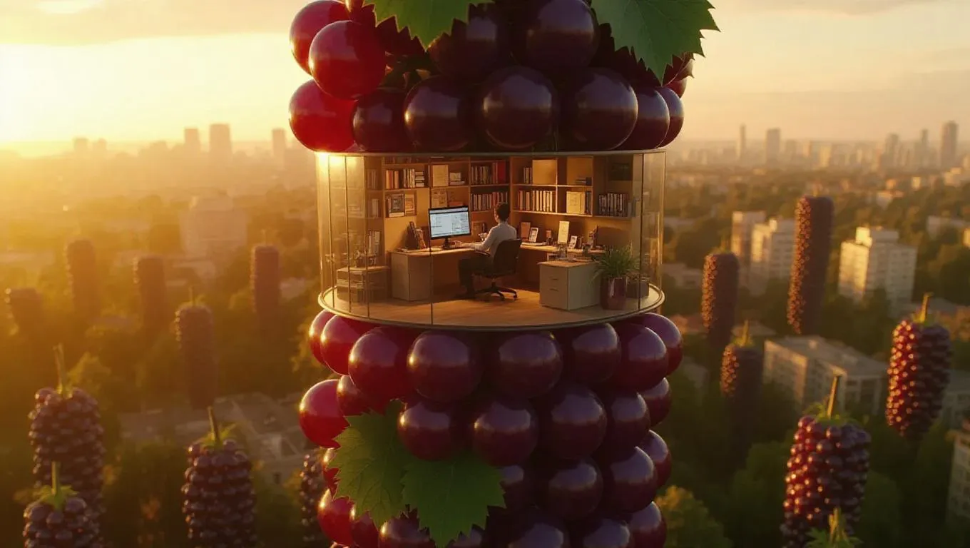 Generate surreal AI imagery of a grape-cluster skyscraper with an office-filled sliced grape. Craft whimsical architectural concepts and imaginative workspaces using vivago.ai's AI tools for aerial views, creative visual storytelling, and innovative design inspiration.