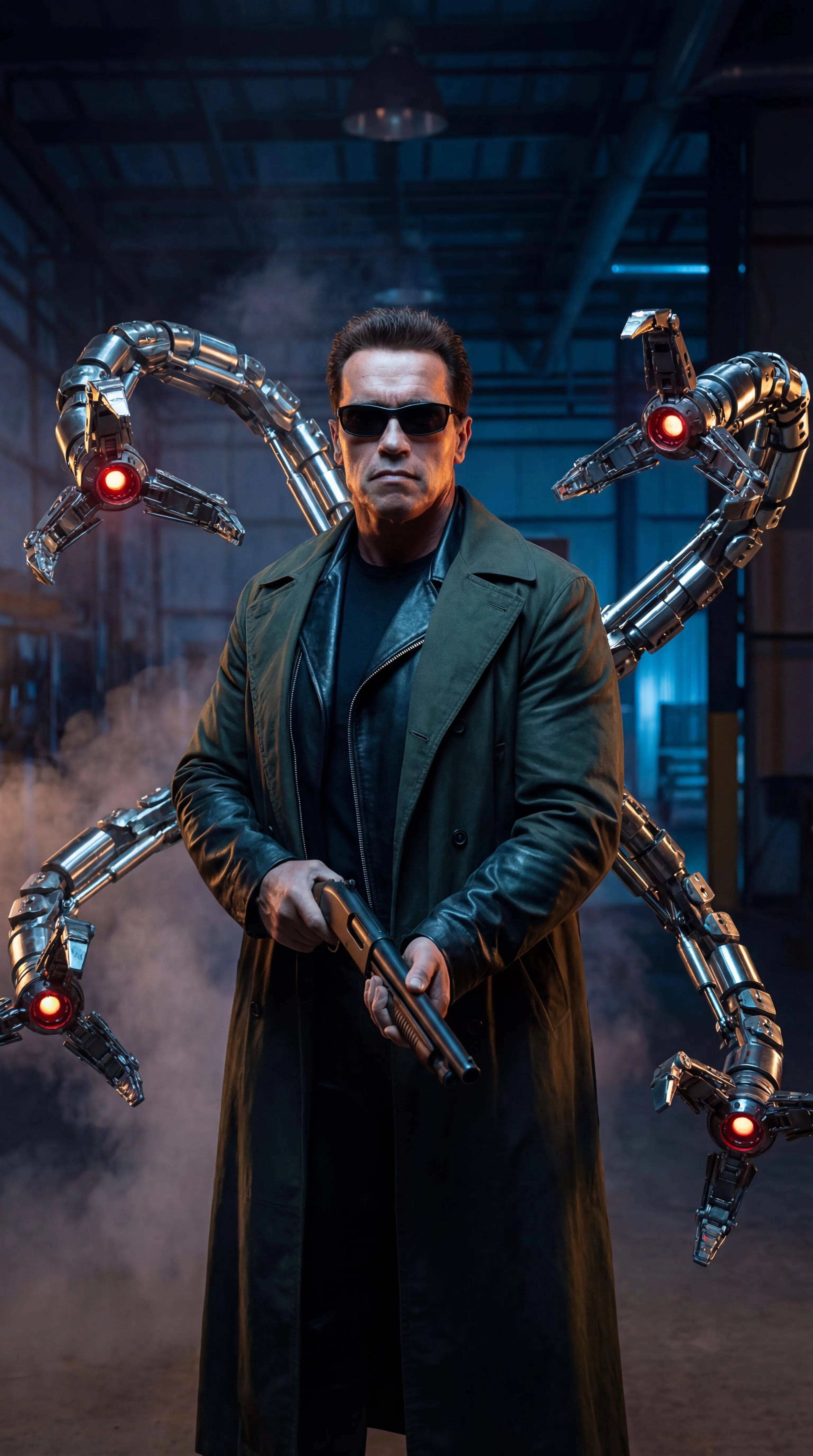 Generate an AI image of Arnold Schwarzenegger as Doctor Octopus with a Terminator twist. Create iconic Spider-Man villain Doctor Otto Octavius reimagined with cybernetic prowess using VivaGo AI's powerful image generator. Turn text prompts into striking visuals.