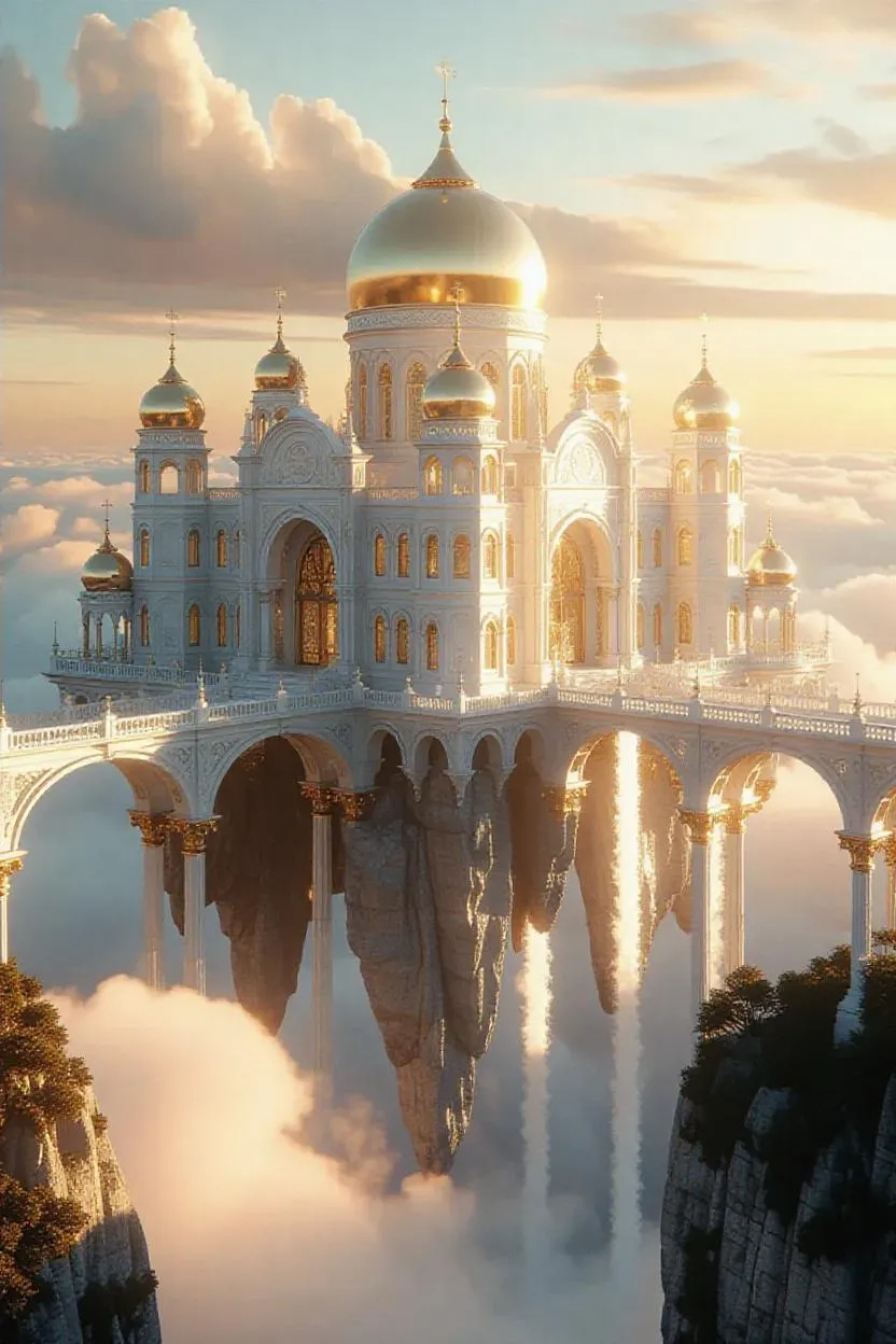 An ethereal palace of white marble and golden domes floating high above radiant clouds at sunrise, soft beams of warm light illuminating intricate bridges and towers, majestic yet dreamy atmosphere, ultra-detailed fantasy art, Polyart model, portrait 2:3, ethereal glow, serene sky, delicate flora, shimmering waterfalls.