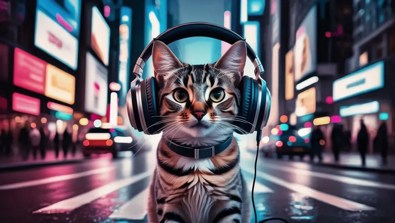 Create a whimsical AI-generated image of a stylish cat wearing headphones on a bustling urban road. Elevate your creativity with vivago.ai's cutting-edge tools, transforming text prompts into vibrant visuals and professional-grade effects for eye-catching, lifelike digital art.
