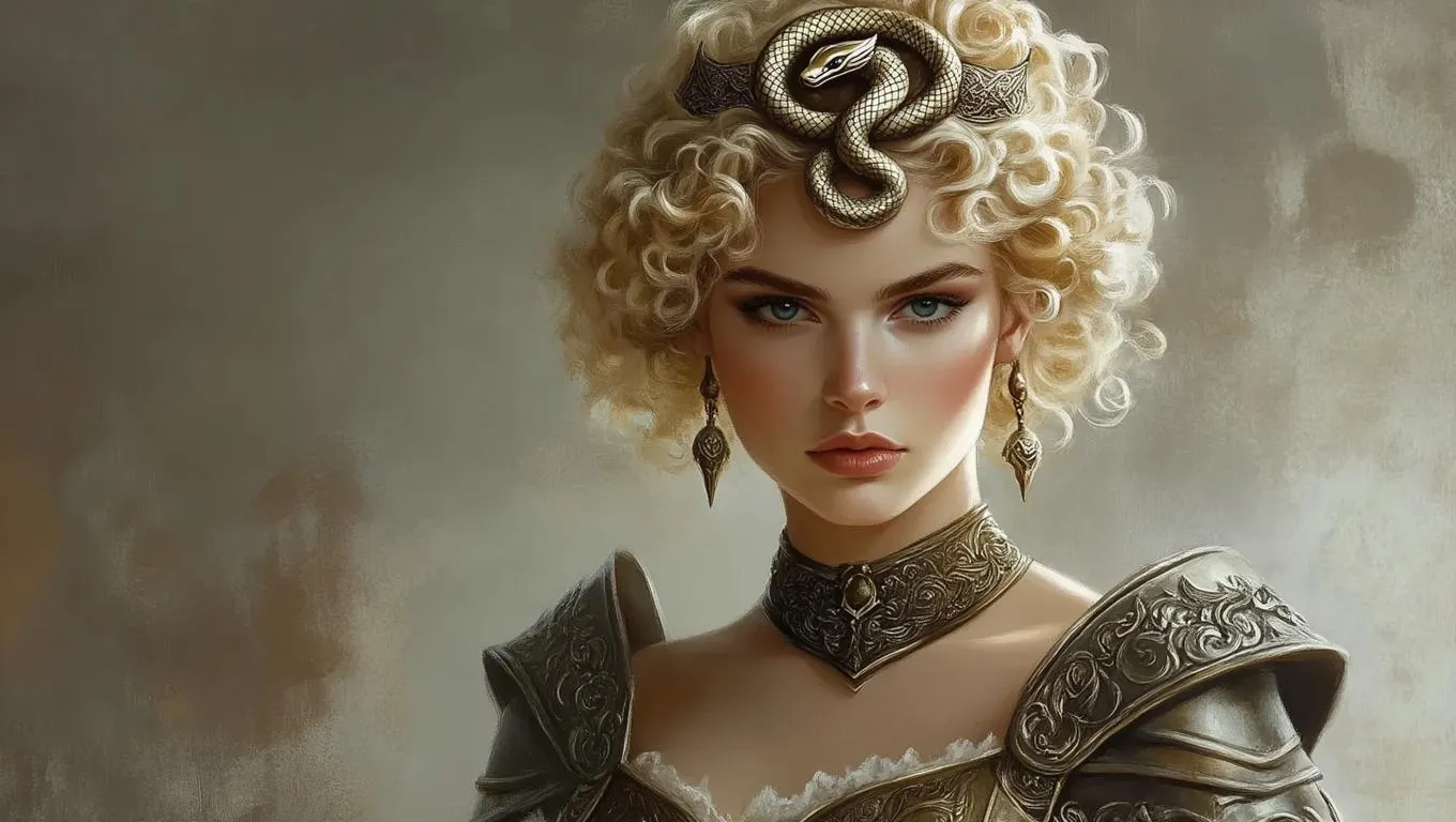 Generate a striking AI portrait of an Illyrian queen with light blonde curly hair and a snake-adorned headpiece, blending armored elegance with regal attire. Vivago.ai's advanced AI transforms text prompts into vivid, detailed imagery, blending mythical elegance with warrior aesthetics for professional-grade creative results.