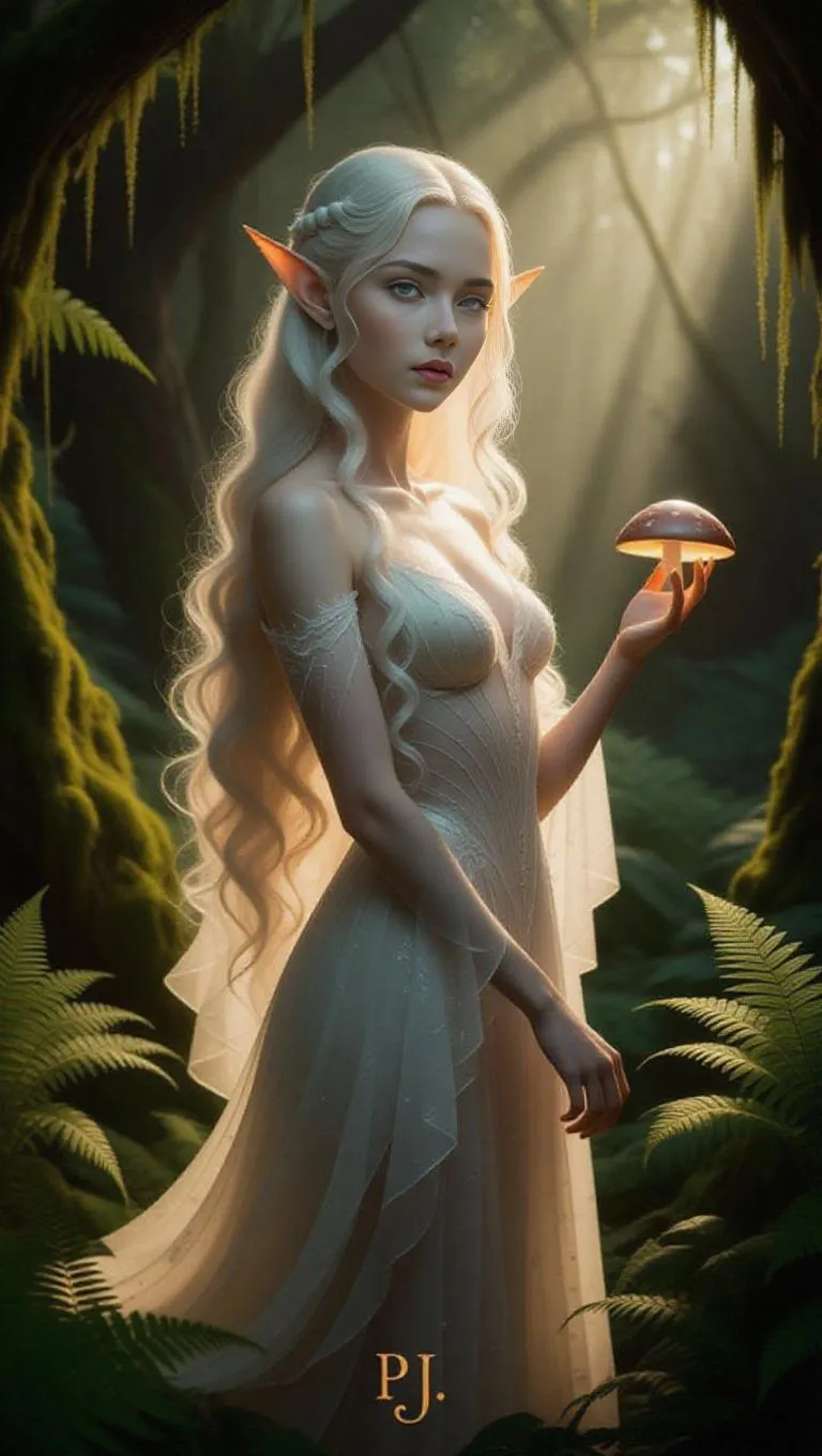An elven girl with long flowing white hair and luminous green eyes stands in a mystical forest, her glowing, porcelain-like skin bathed in soft golden light. She wears an ethereal gown of delicate sheer fabric, its translucent layers hinting at subtle curves and an hourglass silhouette while artfully draping to suggest fantasy elegance. Lush ferns and bioluminescent flora frame her figure, with sunbeams filtering through ancient trees to cast dappled shadows across the scene. The composition emphasizes mystic grace—her pointed ears tilted upward as if listening to forest spirits, one hand gently brushing against a glowing mushroom cap. Rendered in hyper-detailed fantasy art style with vibrant color contrast, cinematic depth, and subtle film grain texture, blending otherworldly beauty with organic wonder.