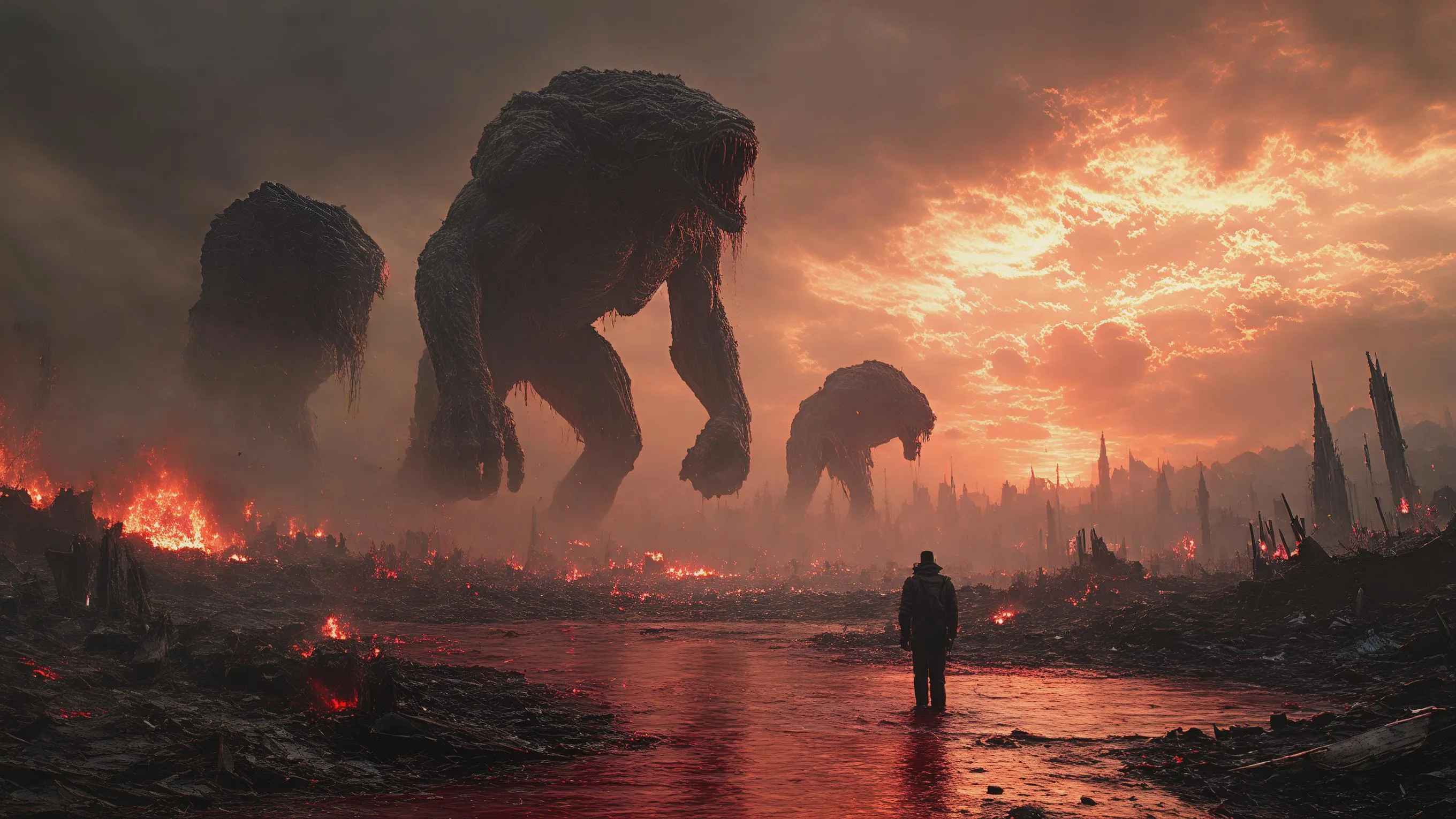 Generate apocalyptic AI art with vivago.ai. Create cinematic scenes of giants ruling a devastated world: burning landscapes, crushed cities, rivers of blood and ash. Dark mythological style, 16:9 scale. Transform text prompts into professional-grade visuals using AI image effects and editing tools.