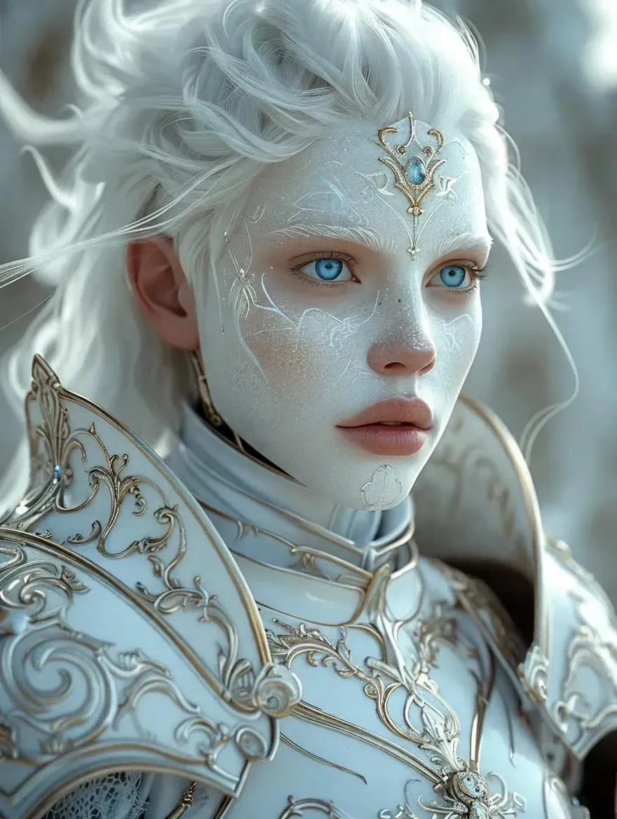 Create a hyper-realistic AI-generated image of a porcelain-skinned humanoid android with striking blue eyes, draped in ornate armor and ethereal wisps. Experience 8K photoreal details, cinematic HDR lighting, and ghostly phantom effects powered by Redshift rendering—perfect for fantasy art, digital realism, and mystical visual storytelling.