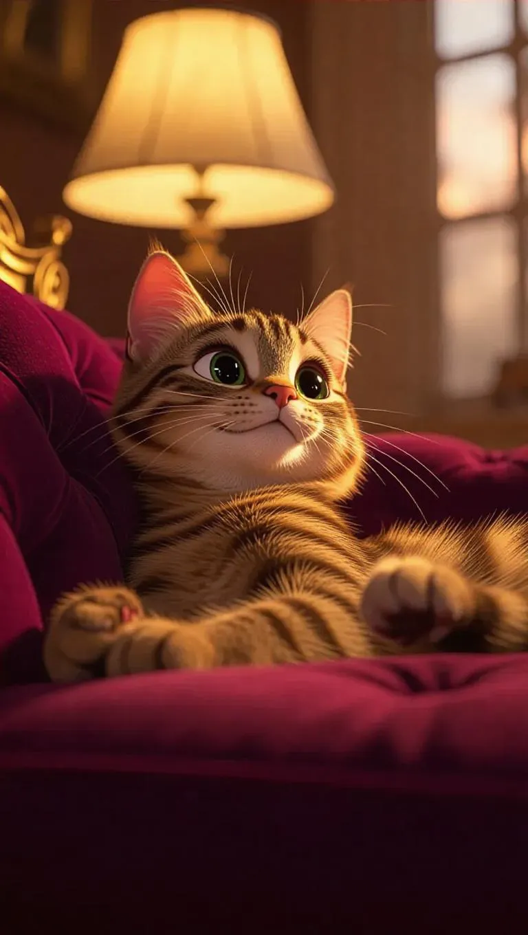Generate a Pixar-style AI image of a sleek cat lounging on a velvet cushion, featuring glistening fur and soft warm lighting. Perfect for wallpaper or pet-inspired digital art. Vivid details, playful charm, and professional AI effects ensure lifelike, whimsical visuals.