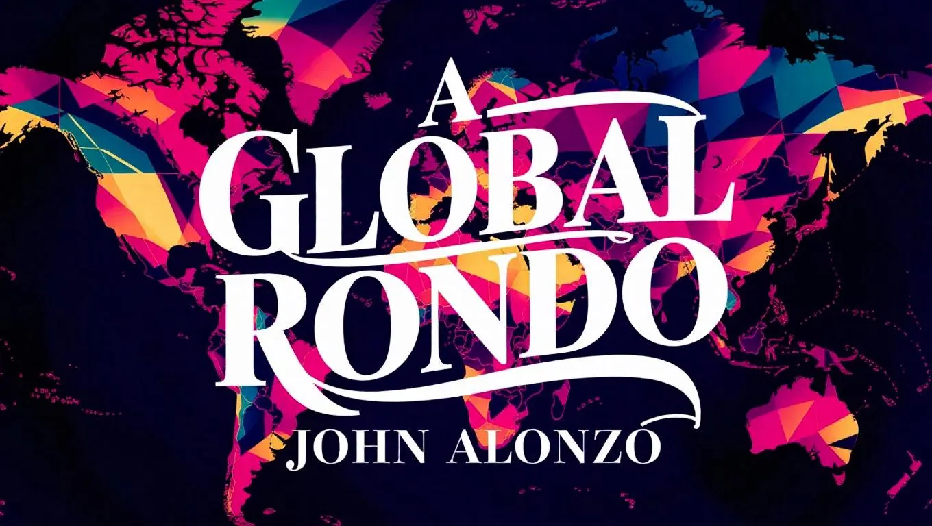A stunning music cover featuring the bold text "A Global Rondo" in dynamic, flowing typography, with "John Alonzo" elegantly displayed below in a complementary font. The background is a vibrant mosaic of world maps, blending abstract patterns and neon colors, evoking a sense of global unity and musical journey.