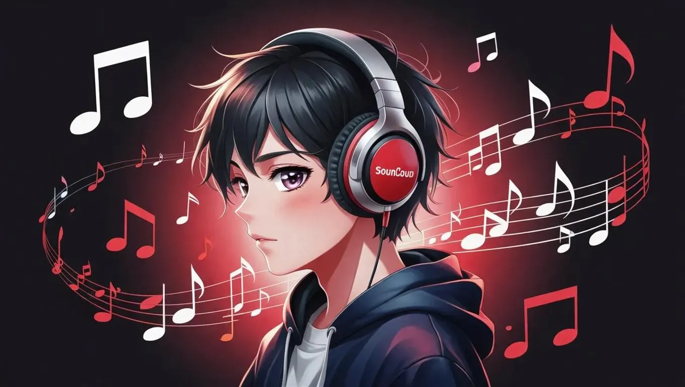Create a striking SoundCloud profile picture with AI: anime-style teenager wearing bold black-and-red headphones, dynamic music notes radiating energy. Perfect blend of edgy aesthetic and vibrant music vibes for your artist brand. AI-generated artwork ensures professional, eye-catching results tailored for music platforms.