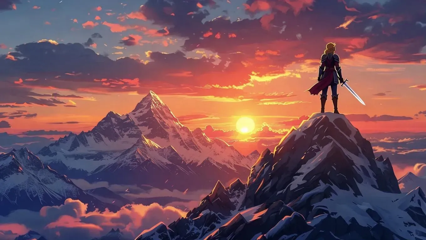 Generate a striking AI-generated warrior princess image without armor, standing on a mountain peak against a dramatic sunset backdrop. Vivago.ai transforms text prompts into vivid fantasy visuals with professional AI effects and editing tools for stunning creative results.