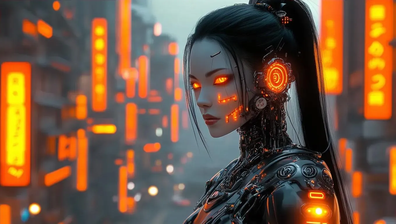 Create a striking cybernetic female samurai with glowing orange eyes, polished silver-black armor, and LED-lit details. Set in a neon-drenched futuristic Japanese cityscape. Ideal for AI-generated cyberpunk art, blending traditional samurai aesthetics with high-tech elements, dynamic lighting effects, and professional-grade visual enhancements.