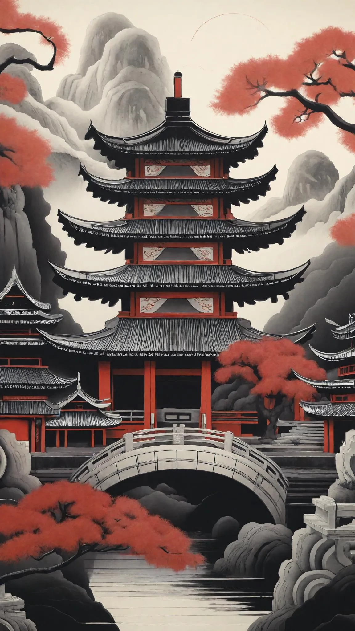 Pastel shallow red, deep black, grays and bright whites Japan ornate old japan depicted in surreal ancient Japanese architecture. Made on scrolls in ancient Japan with essence of a mystical past.