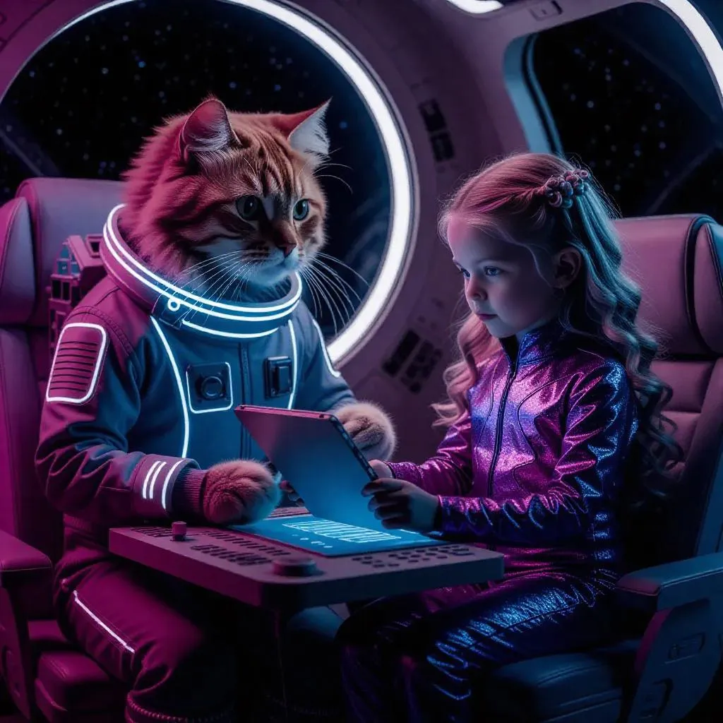 Generate AI images of a futuristic spaceship with a cyberpunk anthropomorphic cat and a blonde girl in glowing neon jumpsuits. Explore intricate spaceship interiors, translucent tech devices, and cosmic views through portholes. Create vivid sci-fi scenes with AI-powered tools for high-resolution, professional visual storytelling.
