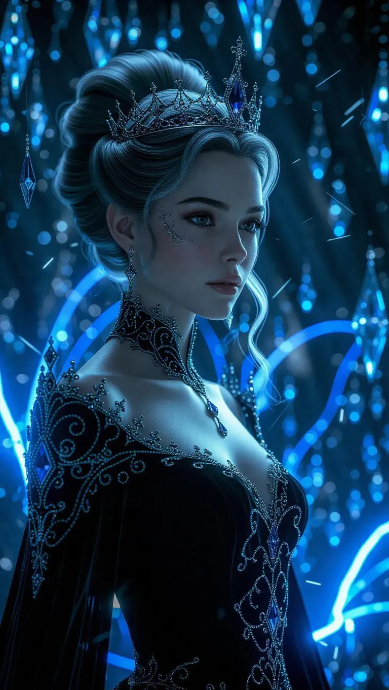 “Wide cinematic shot of a gothic woman standing inside a cathedral made of stained glass. The walls begin to glow and breathe around her — pulsing light through fractured glass, like a living organism. The stained glass bends and cracks inward but suspends in mid-air, swirling around her. Her black dress flows with unseen wind. Dozens of candles light themselves one by one along the edges. Her face is calm but fierce — she is awakening something ancient. The atmosphere is mystical, surreal, divine and eerie.”