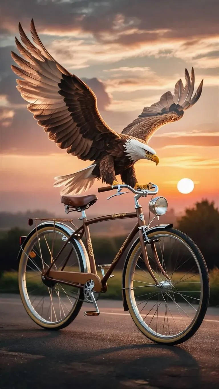 Create a stunning AI-generated hybrid image blending a detailed vintage bicycle with majestic eagle wings. Features a classic leather-seat frame, intricate feather textures, and a vibrant sunset-to-twilight sky backdrop. Symbolizes freedom and adventure through dynamic flight visuals, crafted effortlessly with Vivago.ai's AI art tools for professional, imaginative results.