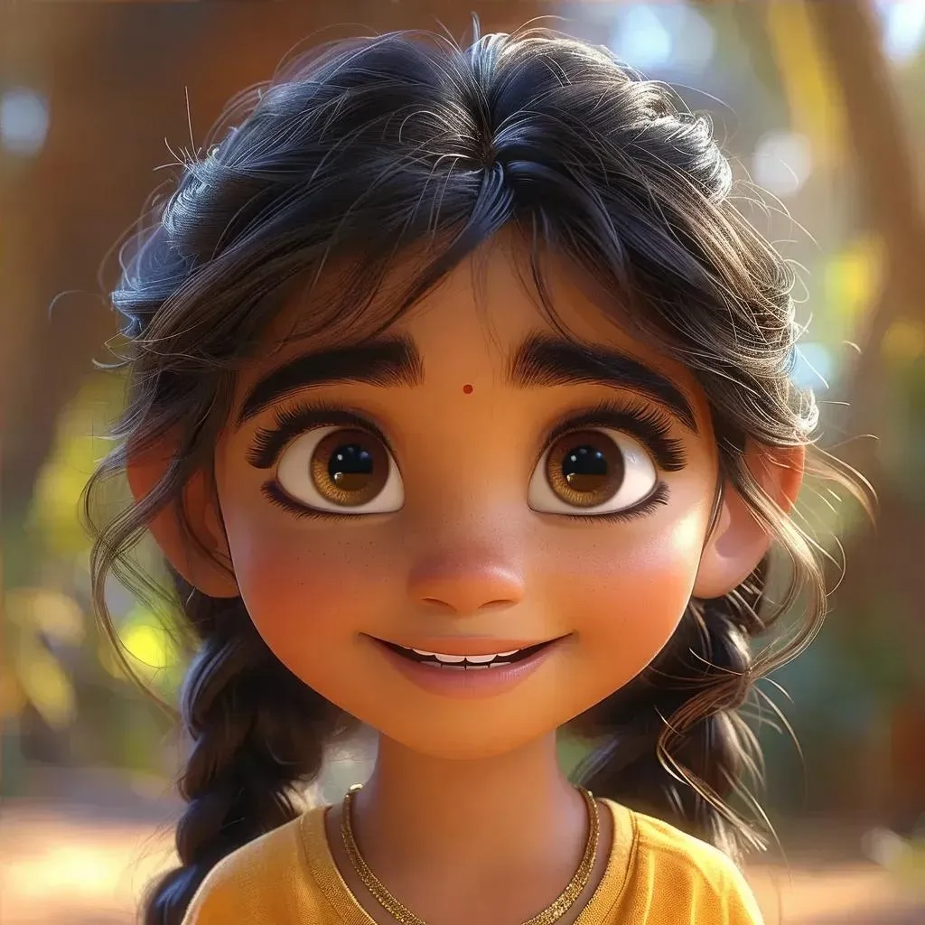 Create a lively Pixar-style animated character of Aaradhya, a 6-year-old adventurer with expressive brown eyes, jet-black braids tied with red ribbons, and a cheerful yellow outfit. AI-powered tools bring her vibrant playground world to life, featuring a pink adventure backpack and dynamic poses. Perfect for storytelling or branding—explore AI image generation to capture her curious spirit and professional-grade animation.