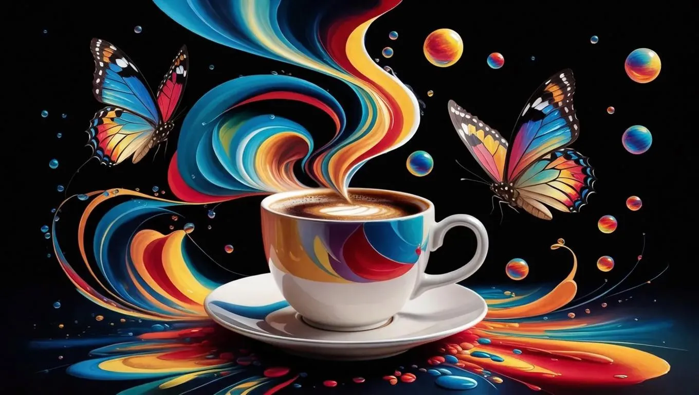 Vibrant abstract coffee cup painting features a whimsical multicolored teapot releasing butterflies, creating a waterfall of blues, reds, yellows. Swirling patterns, floating spheres, droplets. Dark background enhances vibrant hues. AI-generated artistic coffee scene for creative visuals.