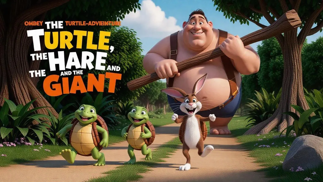 Vibrant AI-generated animation scene from "The Turtle, the Hare, and the Giant" comedy-adventure. Cartoonish forest path features calm Turtle, energetic Hare, and a towering, kind-hearted Giant. Warm lighting highlights comedic surprise as Hare trembles. Rule of thirds emphasizes character expressions and Giant's presence. Ideal for AI-generated storytelling, blending humor, adventure, and dynamic visuals with professional editing tools.
