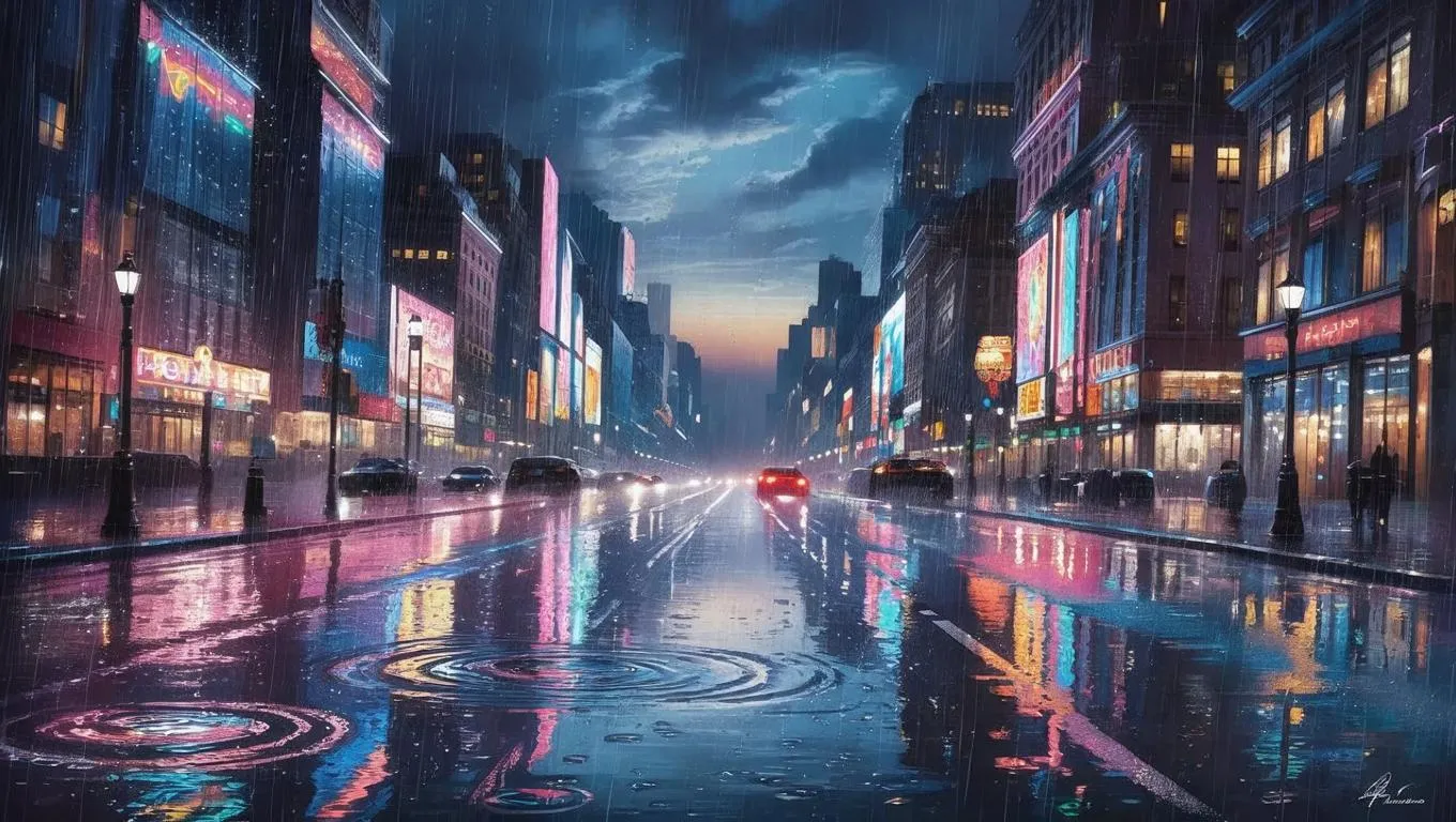 Background: cityscape night, spotlight moon, faint sparks of fireworks.