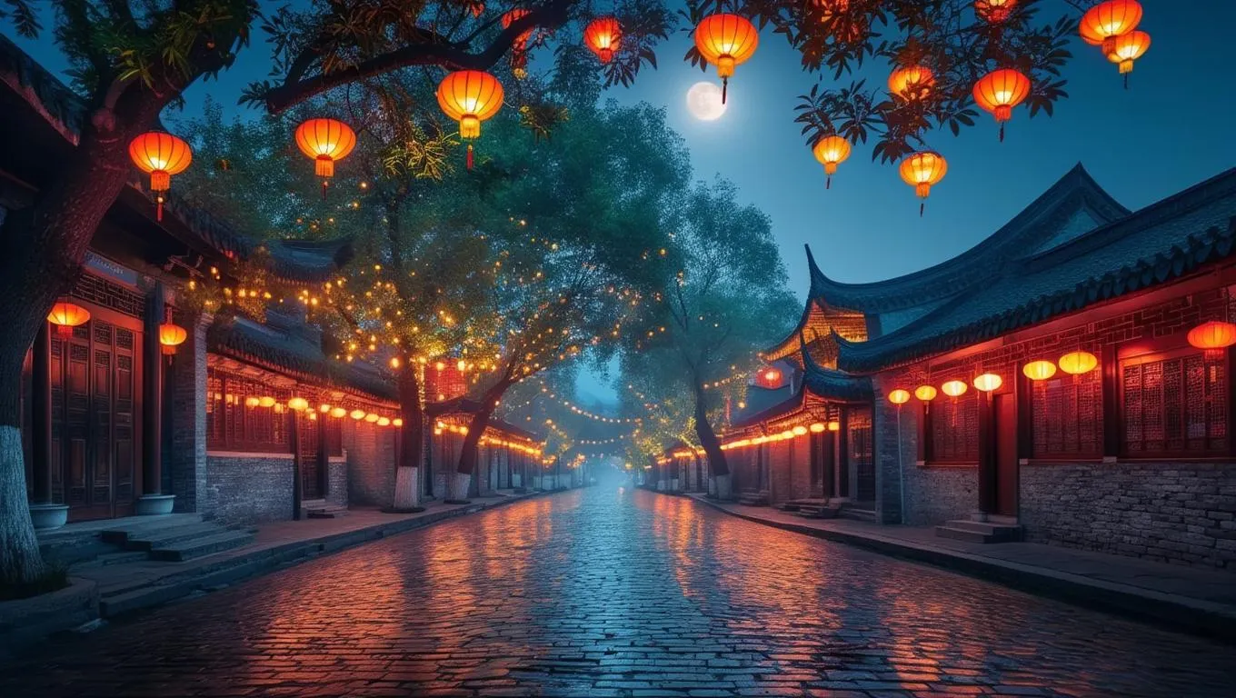 Generate stunning AI images of ancient Chinese night streets with Vivago.ai. Create wide lantern-lit roads flanked by trees adorned with glowing decorations. Our AI image generator transforms text prompts into professional-grade visuals with curated effects and editing tools for captivating historical ambiance.
